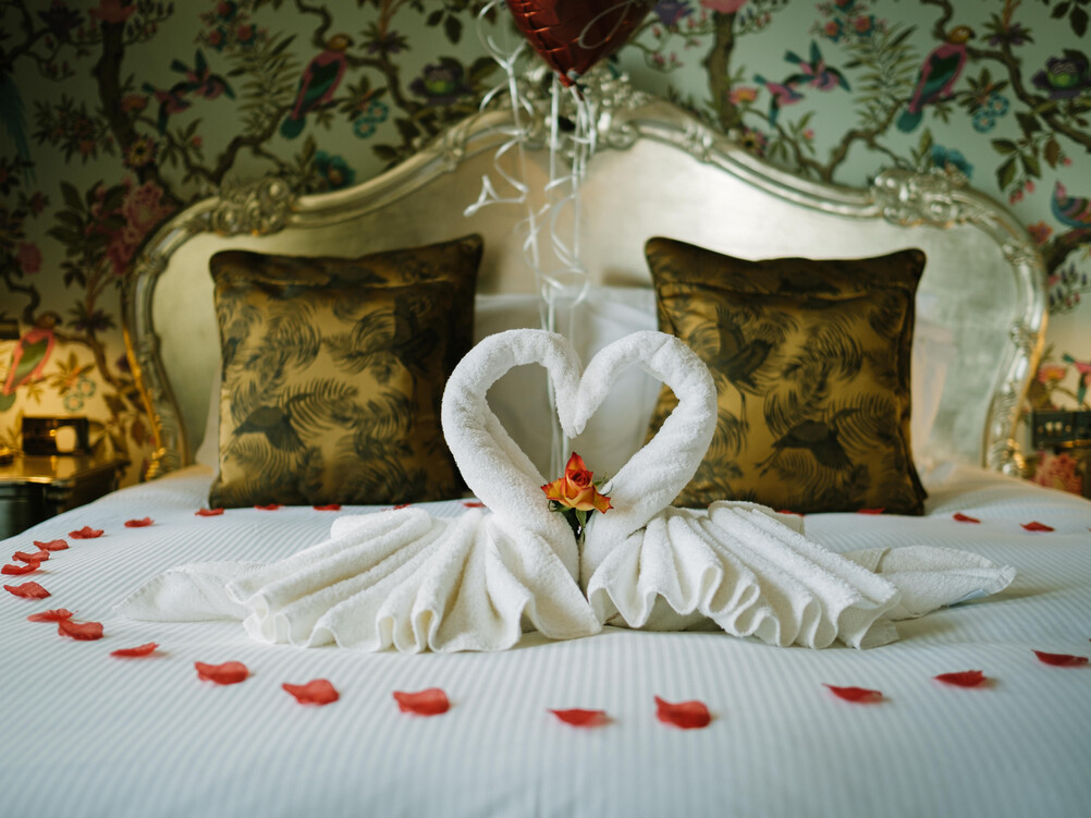 Romantic Swan Towels, Rose Petals & Fresh Rose