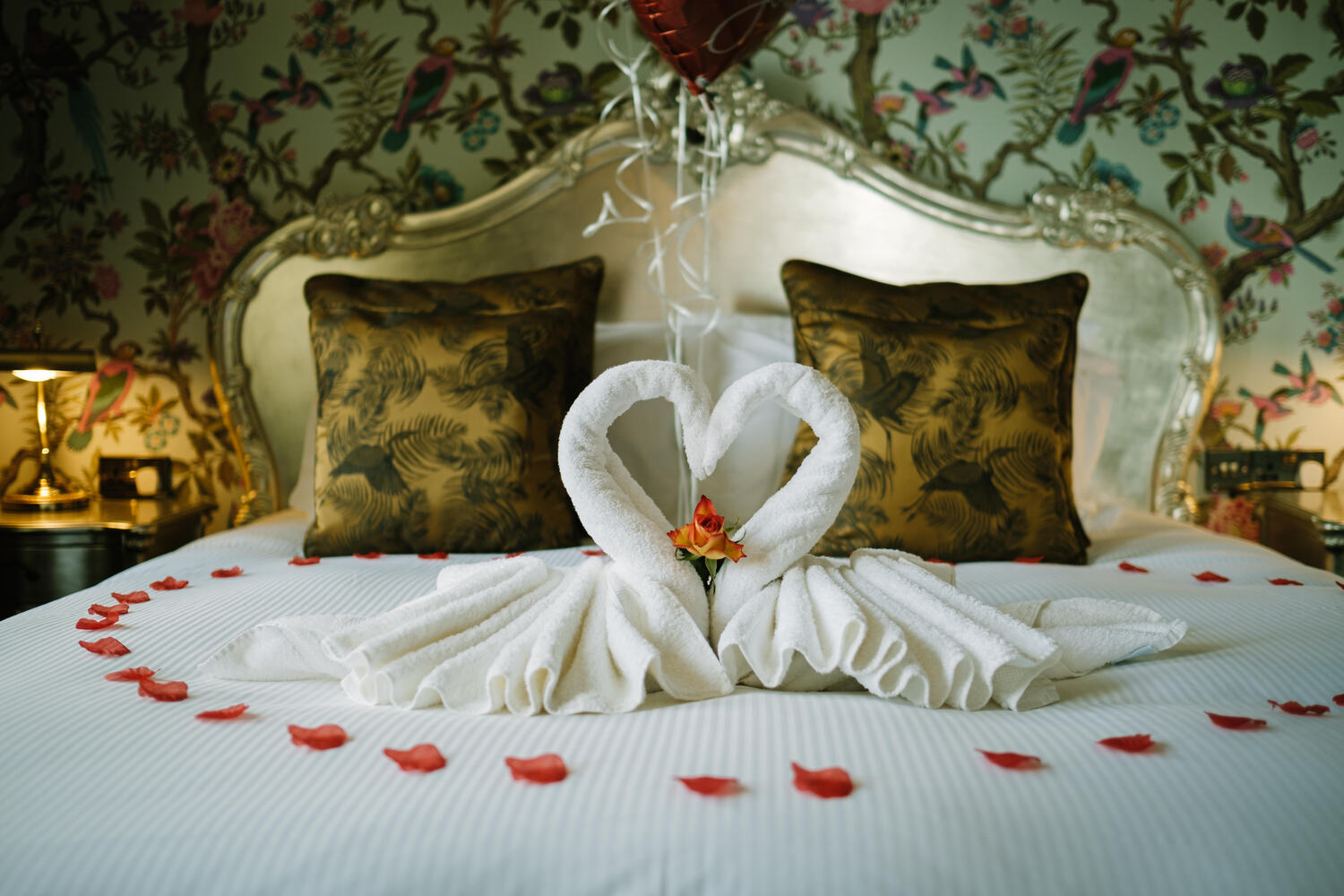 Romantic Swan Towels, Rose Petals and a Fresh Rose in the centre of the Heart